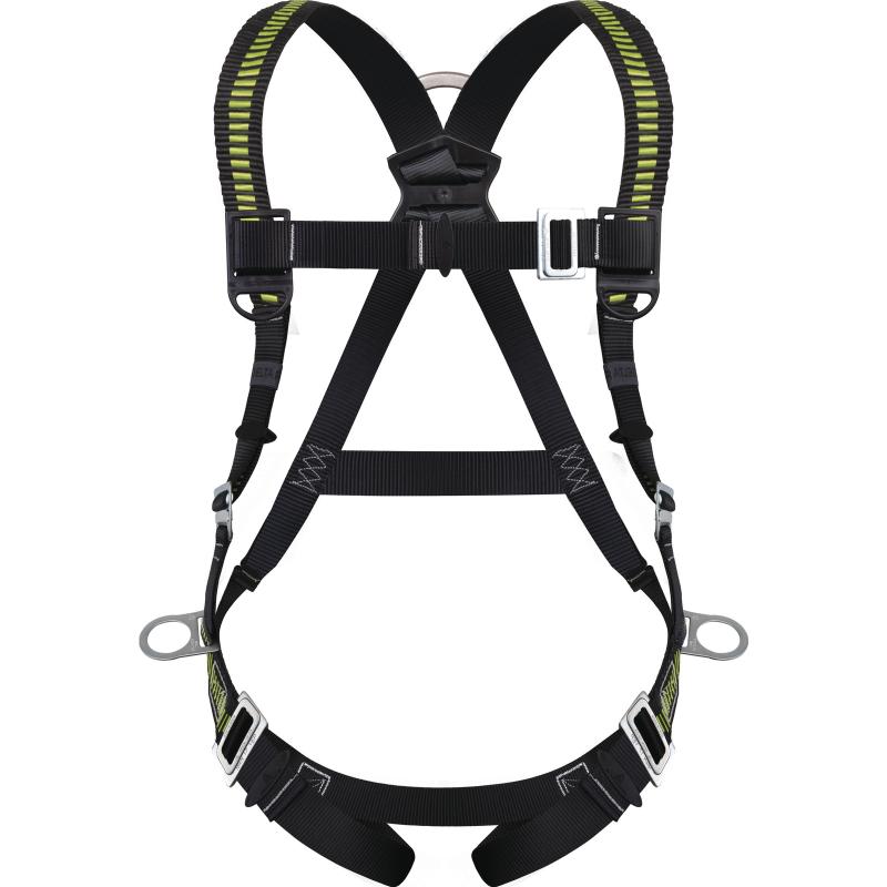 Two-color harness. 1 fall arrester anchorage point (back). 2 work positioning attachment points (lateral). 5 adjustable buckles. 2 park lanyards.