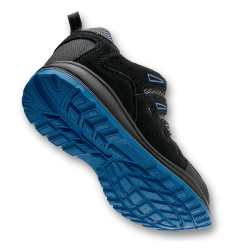 Features a double-density PU black midsole/blue sole, steel toecap, and Kevlar midsole for S1P protection.