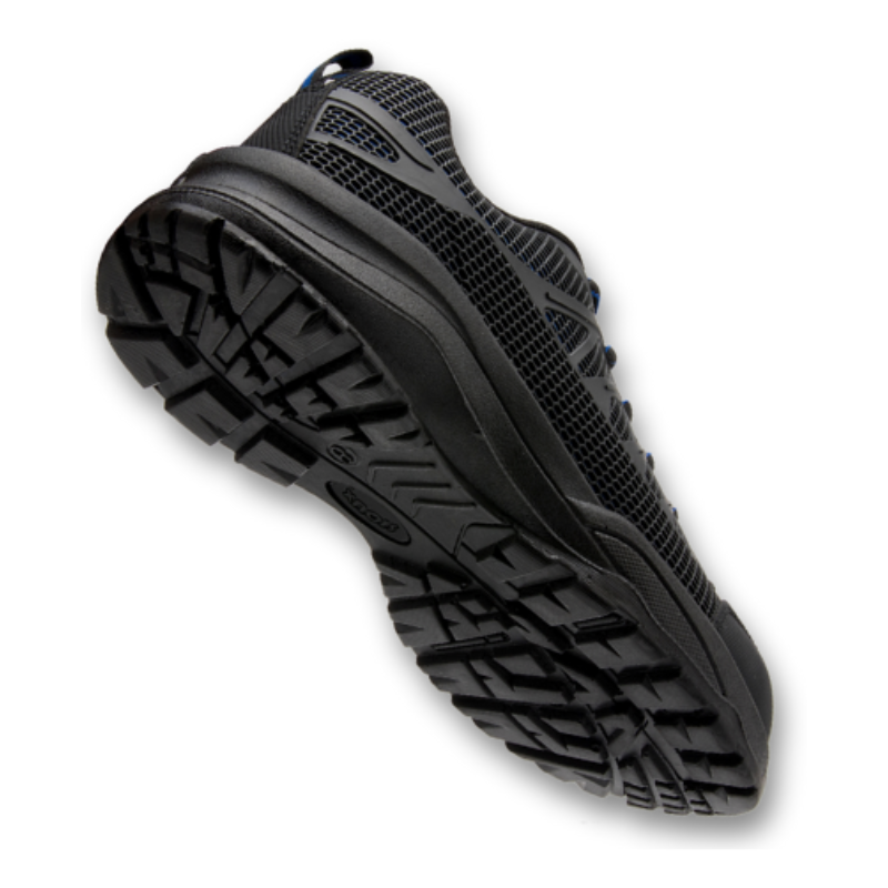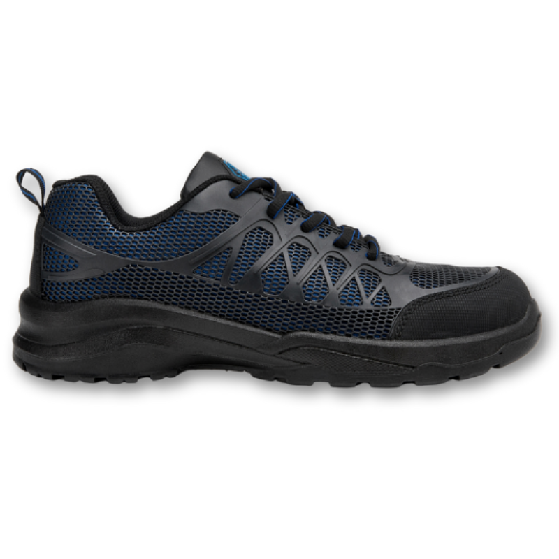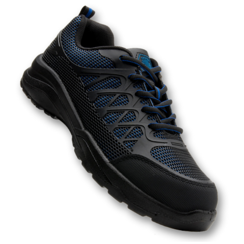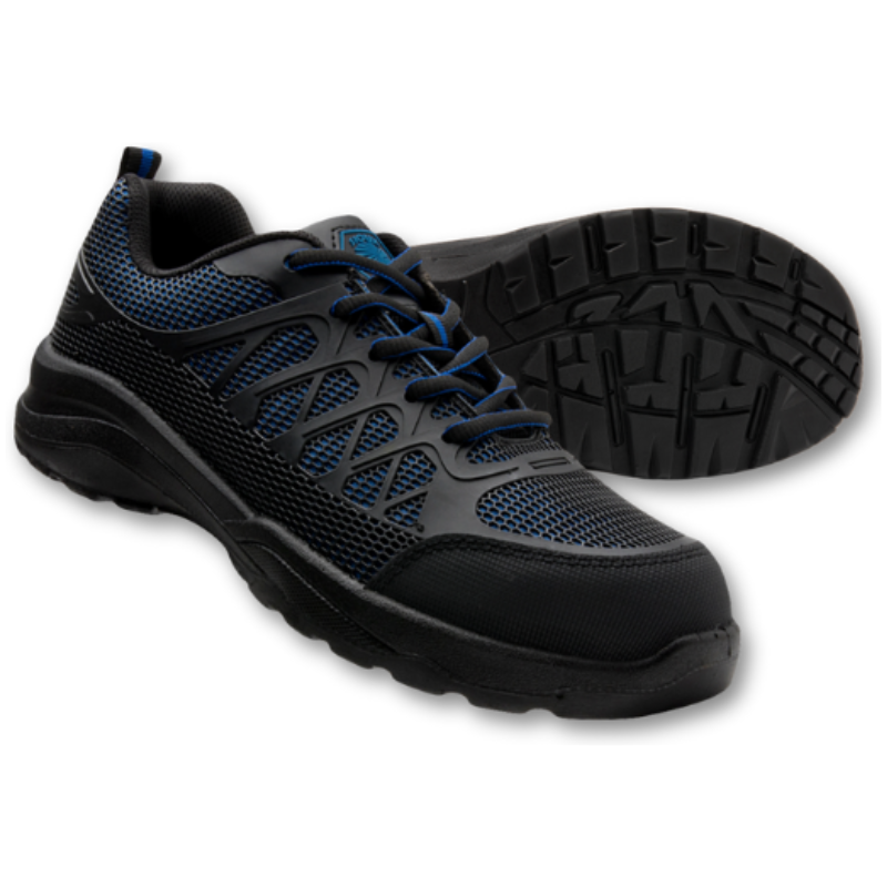 Blue sporty safety shoes with black PVC and blue fabric upper.