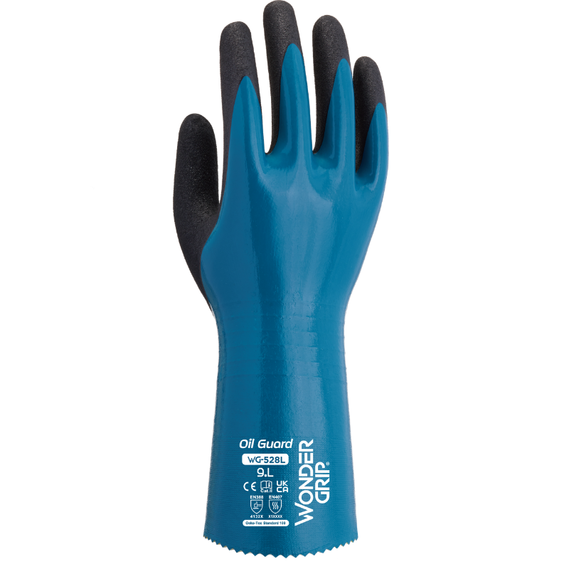 The WONDER GRIP WG-528L OIL GUARD oil-resistant gloves protect hands in oily and greasy jobs where you do not need cut protection. First, a triple nitrile coating over a nylon liner stops industrial oils from soaking through to your skin. This tough outer layer also resists scrapes and tears during heavy work.
